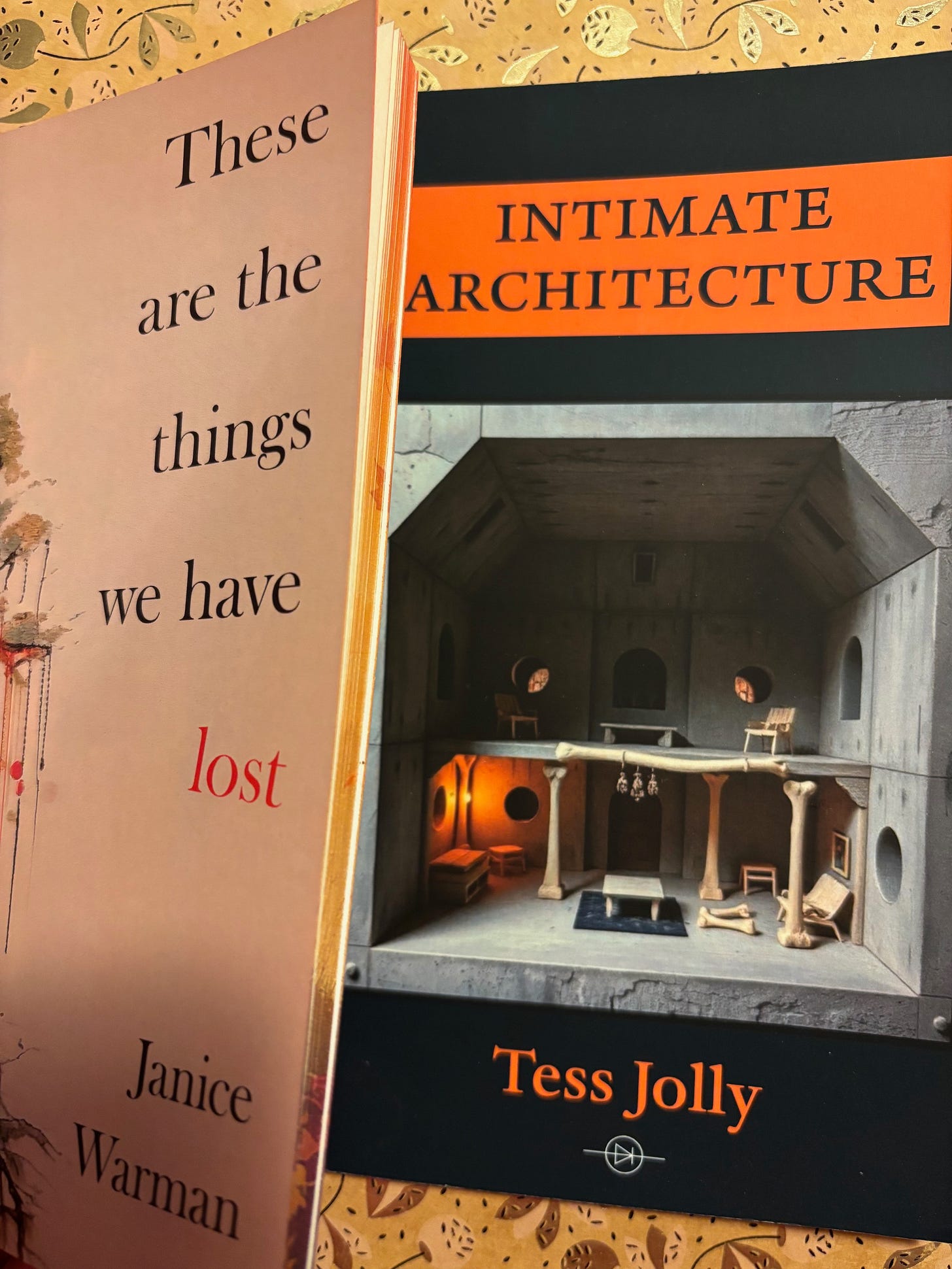 Other reading: two poetry books, both with fabulous covers: Tess Jolly’s Intimate Architecture (Blue Diode Press) and Janice Warman’s These Are the Things We Have Lost (Fly on the Wall Press).